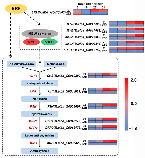 As an advanced NGS technology, transcriptome sequencing is widely used to predict new genes, novel functions of old genes and genome evolution in plants. Comparing cultivars with different flesh colors can help identify different anthocyanin biosynthesis genes [8,31,32]. Comparative transcriptome sequencing of ZJ and ZZB revealed different expressions of genes regulating anthocyanin biosynthesis. In transcriptomic analysis, the expression abundances of CHS (M.alba_G0019389), CHI (M.alba_G0003811), F3H (M.alba_G0005697), DFR1 (M.alba_G0013172), DFR2 (M.alba_G0013173) and ANS (M.alba_G0005420) were significantly up-regulated and were strongly correlated with the anthocyanin content during fruit development and maturation (Figure 1C and Figure 6). Similarly, in Morus, high transcript levels of these genes were detected in purple fruits of mulberry cultivars ‘Da10’ and ‘Hongguo2’, but not in white fruits of mulberry cultivars ‘Zhenzhubai’ and ‘Baiyuwang’, respectively [11,13].