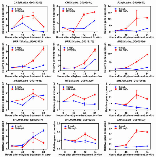 Additionally, qRT-PCR results suggested that the expression levels of structural genes involved in anthocyanin biosynthesis (CHS, CHI, F3H, DFR1, DFR2 and ANS) significantly increased as the ethylene concentration increased in ZJ fruits in vitro (Figure 8). Meanwhile, the TF genes, such as MYB (M.alba_G0017209), bHLH (M.alba_G0012659), bHLH3 (M.alba_G0016257) and ERF (M.alba_G0016603), were significantly up-regulated by ethylene treatments (Figure 8). In particular, the expression of ERF (M.alba_G0016603) increased seven-fold at 72 h after ethylene treatment with 300 mg/L concentration (Figure 8). These results indicated that ERF (M.alba_G0016603) can specifically up-regulate expression in response to ethylene and promote anthocyanin accumulation in mulberry fruits.