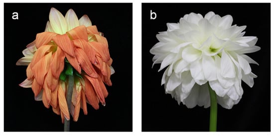 Dahlia (Dahlia × hortensis Guillaumin) belongs to Asteraceae and originated in the highlands of Central and South America. There is marked variation in the size, color, and floral shape in the flowers of the dahlia cultivars. The dahlia has mainly been used as a bedding plant. Recently, dahlia flowers have become used for cut flowers in Japan, but the vase life of cut dahlia flowers is significantly short [,].