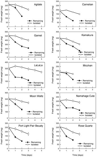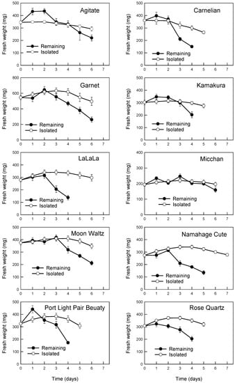 The fresh weight of petals remaining in the inflorescence in ‘Micchan’ was almost constant throughout the experimental period (Figure 2). The fresh weight of petals remaining in the inflorescence in the other nine cultivars slightly increased during the first 1–3 days and decreased thereafter.