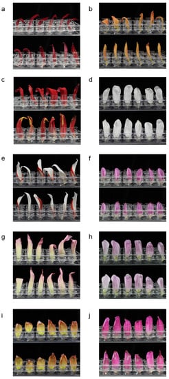 The effect of water supply on recovery from wilting in isolated petals of 10 cultivars. The upper panel shows petals on the day of wilting, and the lower panel shows petals 1 day after the start of water supply in each cultivar. (a) ‘Agitate’; (b) ‘Carnelian’; (c) ‘Garnet’; (d) ‘Kamakura’; (e) ‘LaLaLa’; (f) ‘Micchan’; (g) ‘Moon Waltz’; (h) ‘Namahage Cute’; (i) ‘Port Light Pair Beauty’; (j) ‘Rose Quartz’.