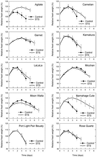 The relative fresh weight of control flowers in these 10 cultivars increased during the first 1–3 days, and decreased thereafter (Figure 5). Treatment with STS suppressed decreases in the relative fresh weight of ‘Agitate’, ‘Carnelian’, ‘Garnet’, and ‘Namahage Cute’. In ‘Moon Waltz’, the STS treatment suppressed an increase in the relative fresh weight but suppressed these decreases. However, STS treatment only slightly affected the relative fresh weight in ‘Kamakura’, ‘Micchan’, ‘Port Light Pair Beauty’, and ‘Rose Quartz’.