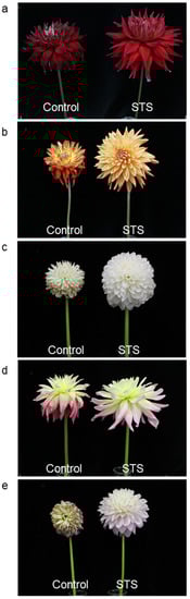 The effect of pulse treatment with STS on the vase life of cut dahlia. (a) ‘Agitate’ on day 3; (b) ‘Carnelian’ on day 4; (c) ‘Kamakura’ on day 5; (d) ‘Moon Waltz’ on day 5; (e) ‘Namahage Cute’ on day 7.