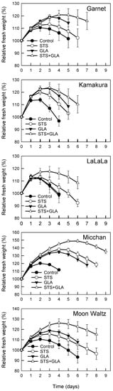 The relative fresh weight of these five cultivars in control increased during the first 1–2 days, and decreased thereafter (Figure 7). The relative fresh weight of ‘Kamakura’ and ‘Micchan’ flowers was increased by the STS treatment more than by the GLA treatment. The increases in the relative fresh weight in these cultivars were promoted more by the combined treatment with STS and GLA than by the STS alone and the GLA alone.