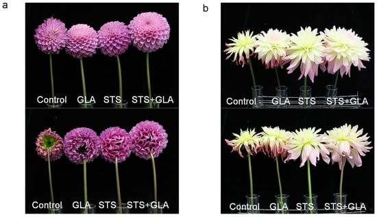 Effect of pulse treatment with STS followed by continuous treatment with GLA on the vase life of cut dahlia. (a) ‘Micchan’ on day 7; (b) ‘Moon Waltz’ on day 7. The upper and lower panels are focused on the inner and outer petals, respectively, in each cultivar.