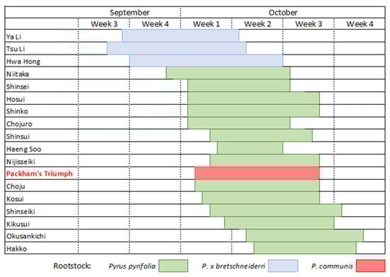 Flowering times for nashi in Orange, NSW, in relation to the European pear cultivar ‘Packhams’ Triumph’ (adapted from NSW DPI, https://www.dpi.nsw.gov.au/agriculture/horticulture/pomes/other/nashi (accessed on 26 August 2021)).