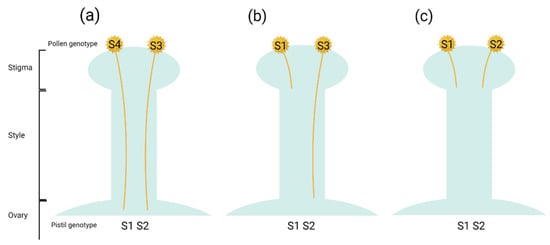 Self-incompatibility reactions: (a) cross-compatible, (b) semi-compatible and (c) cross-incompatible (Source: created in Biorender.com).