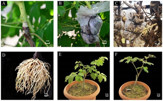 Steps in air layering of tree peony. (A) One-centimeter ring-stripping incision. (B) Matrix dressing. (C) The substrate is covered with new roots. (D) The new roots under air layering. (E,F) Air-layer growth in pots one year from the air layering.