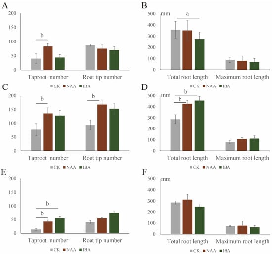 As indicated in Figure 2A, the number of taproots in ‘Baoqing Hong’ under NAA treatment was twice as high as in the control (CK). Under IBA treatment, the number of taproots was slightly higher than that of the control group, though the difference was not significant. The number of root tips of ‘Baoqing Hong’ was lower than that of the control group under the two growth-regulator treatments (Figure 2A). Figure 2B indicates that the total length and maximum length of the primary roots of ‘Baoqing Hong’ under NAA treatment were similar to those of the control group. When IBA was applied, the total and maximum root length were slightly lower than those of the control group. Figure 2C showed that the numbers of primary roots and root tips of ‘Quehao’ with the growth regulator were significantly higher than those of the control (CK), which under the NAA treatment were slightly higher than those under the IBA treatment. As indicated in Figure 2D, the total length and maximum root length of the primary roots in ‘Quehao’ with the growth regulator were significantly higher than those of the control (CK), which under the IBA treatment were similar to those under the NAA treatment. As shown in Figure 2E,F, the number of main roots in the root system of ‘Xishi’ under the NAA and IBA treatments was significantly higher than that of the control group. The number of root tips under the NAA treatment was slightly higher than that of the control group, but significantly higher under IBA treatment. The total length and maximum length of the primary roots were slightly higher under NAA treatment than in the control (CK), but lower under IBA treatment. The results showed that NAA and IBA could affect the number and length of roots differently, although a varied response to the treatments was noted.