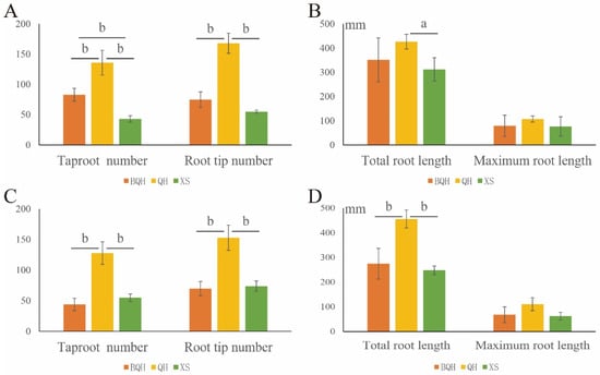 Comparison of the root characteristics among the three cultivars of tree peonies under air layering. (A) Comparison of the number of taproots and root tips of three cultivars treated with NAA at 1000 mg/L; (B) the total length and maximum root length of the primary roots of three cultivars treated with NAA at 1000 mg/L; and (C,D) comparison of the same root characteristics among the three cultivars treated with IBA at 1000 mg/L. BQH: Baoqing Hong; QH: Quehao; XS: Xishi. a indicates significant differences, 0.01 < p < 0.05; and b indicates highly significant differences, 0.01 < p < 0.05.