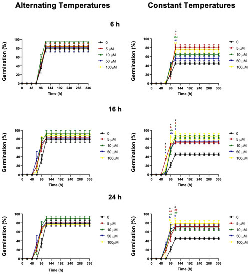 Effects of cyanide on wild cardoon (C. cardunculus var. sylvestris) achene germination. Pre-treatments with KCN at different concentrations (5, 10, 50 or 100 µM) were carried out for 6, 16 or 24 h and then the achenes were imbibed at alternating (10/20 °C) or constant (15 °C) temperatures. For control treatment (0), achenes were imbibed in water. Different coloured letters represent the significant differences according to one-way ANOVA and Tukey test (p < 0.05) between cyanide-pre-treated samples (KCN) and the control (H2O). For alternating temperatures, there was no significant difference.