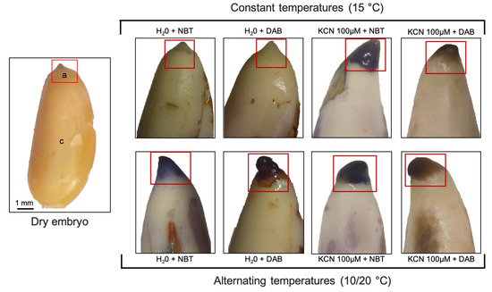 Analysis of O2 − and H2O2 in wild cardoon (C. cardunculus var. sylvestris) embryos obtained with NBT and DAB staining, respectively. On the left, dry embryo showing axe (a) and cotyledon (c); On the right, staining of the embryonic axis by NBT or DAB imbibed at constant temperatures (15 °C), upper part, or alternating temperatures (10/20 °C) treated with 100 µM of KCN for 16 h or in H2O (control). Photographs are representatives of at least 10 replicates.