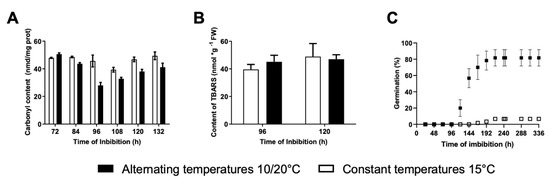 Protein and lipid peroxidation in wild cardoon (C. cardunculus var. sylvestris) embryos imbibed at constant (15 °C) (open bars) or alternating temperatures (20/10 °C) (filled bars). (A) Protein carbonyl content during imbibition of achenes. (B) Lipid peroxidation was measured as TBARS content. (C) Germination dynamics at alternating (circles) and constant temperatures (squares).