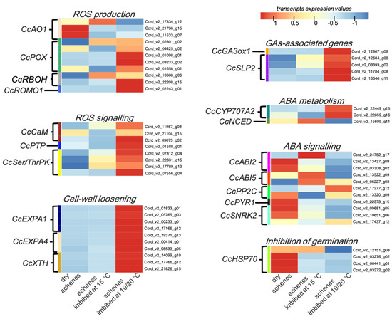To shed light on the possible ROS mediation into seed dormancy termination in cardoon achenes, we analysed the available transcriptome dataset [20], including dry, imbibed at 15 °C and imbibed at 10/20 °C for 48 h cardoon achenes. Novel gene annotation is provided for transcripts identified in this study (see Supplemental Material, Table S1). Expression patterns were evaluated for each gene as Transcripts per Millions (TPM) and normalised among samples focussing on ROS production and signalling and the most widely known regulating factors of seed dormancy (Figure 4).