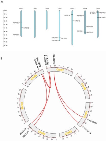Distribution on chromosomes and homology analysis of RcTCP gene family. (A) The distribution of RcTCP gene family on chromosomes; (B) The chromosome distributions and syntenic analysis of RcTCP genes. The approximate positions of RcTCP gene were marked on the circle. The red curve denotes the syntenic relationships between RcTCP genes.