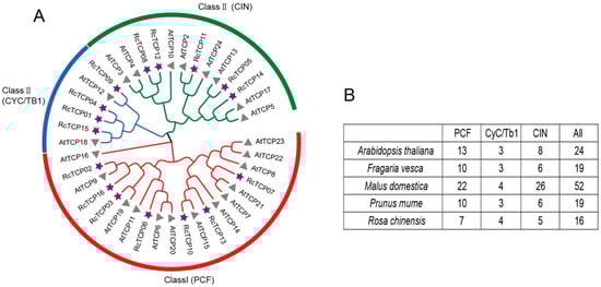 The phylogenetic tree of RcTCPs. (A) The phylogenetic tree of TCP proteins from R. chinensis and A. thaliana. (B) Number of each subclass of TCP genes in Rosaceae family and A. thaliana.