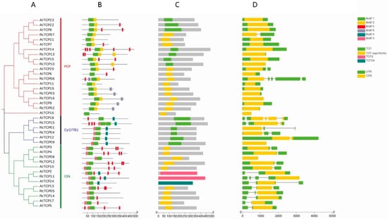 The sequences of R. chinensis genes were obtained from GDR (Genome Database for Rosaceae, https://www.rosaceae.org (accessed on 15 April 2022)). The sequences of A. thaliana TCP genes were downloaded from phytozome (https://phytozome-next.jgi.doe.gov/ (accessed on 15 April 2022)). Subsequently, the possible TCP proteins were retrieved from R. chinensis by using the BLAST Wrapper function in TBtools (https://github.com/CJ-Chen/TBtools (accessed on 16 April 2022)) with the sequences of AtTCP protein sequences as queries, and followed by verification of TCP domain existence and integrity using HMMER searching (http://www.ebi.ac.uk/Tools/hmmer/ (accessed on 16 April 2022)), SMART (https://smart.embl-heidelberg.de/ (accessed on 16 April 2022)), Pfam database (PF03634) (https://pfam.xfam.org/ (accessed on 17 April 2022)), and CDD/NCBI (https://www.ncbi.nlm.nih.gov/Structure/cdd/wrpsb.cgi (accessed on 17 April 2022)), and removing redundant and short sequences manually. Finally, all RcTCP genes were obtained for further analysis.