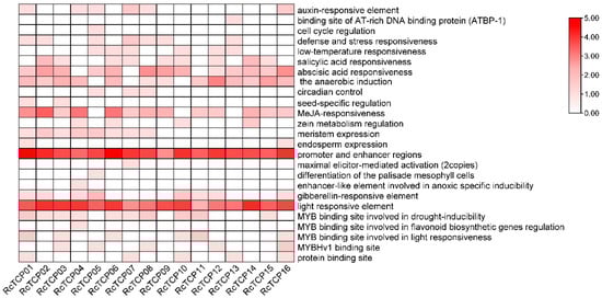 The cis-acting elements in the promoters of RcTCP genes. PlantCARE predicted cis-regulatory elements (CRES) in the RcTCP gene promoter region (upstream 2000 bp). The heatmap represent the abundance of the copy number of cis-regulatory elements.
