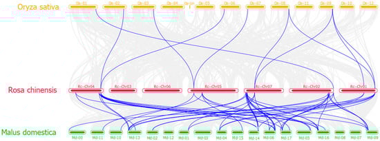 The collinearity relationships between TCP genes in R. chinensis, rice and apple. The red block represents the chromosome of R. chinensis, the orange block represents the chromosome of O. sativa, the green block represents the chromosome of M. domestica, the gray line represents the synteny blocks, and the blue line represents the collinearity relationships between TCP gene pairs.