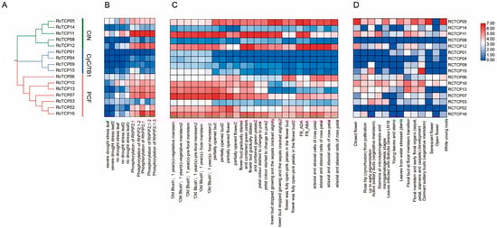 To better understand the functional profiles of RcTCP genes in R. chinensis, transcript levels of RcTCP genes in different tissues were analyzed based on various public RNA-seq datasets (Supplemental Table S3). As shown in Figure 6, most of the RcTCP genes from the PCF subclass, and three out of five RcTCP genes from the CIN subclass were highly expressed or induced in majority of the tissues and treatments. In contrast, the expression levels of RcTCP genes from CyC/TB1 subclass were generally low, except RcTCP5 which was specifically highly expressed in dominant and active axillary buds. These results suggested the functional diversification of RcTCP between different subclasses. Interestingly, although RcTCP genes were barely expressed under drought treatments, three genes (RcTCP05, RcTCP11 and RcTCP12) from the CIN subclass and six genes (RcTCP06, RcTCP10, RcTCP13, RcTCP07, RcTCP02 and RcTCP16) from the PCF subclass were highly expressed under the condition of phosphorylation of RhPIP2; 1 (Figure 6B), which controls the transmembrane transport of water and plays a crucial role in petal expansion and stress response [,]. These results suggested that there are functional differences of RcTCP genes in the response to drought stress, and the CIN and PCF subclasses play an indirect role in the regulation of drought stress rather than being directly involved.