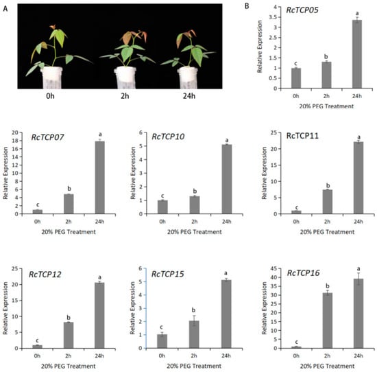Expression patterns of RcTCP genes under PEG treatments (determined by RT-qPCR). (A) The method of PEG treatments. (B) The expression of RcTCP genes under 0 h, 2 h and 24 h of PEG treatments determined by RT-qPCR. The RcGAPDH gene was used as the internal control, and three biological and technical replicates were conducted. The relative expression levels of each gene were calculated using the 2−∆∆CT method. Each bar shows the mean ± SE of the triplicate assay, and different letters indicates significant difference at p < 0.05 according to Duncan’s multiple range test.