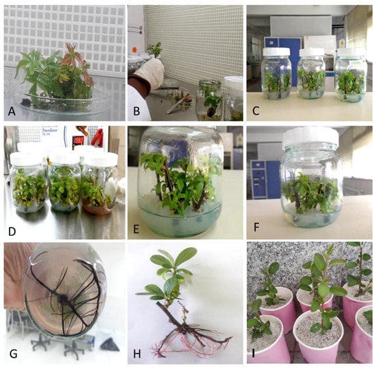 In vitro propagation of Pyracantha angustifolia. (A) Shoots produced in the initiation step in the MS medium containing 0.5 mg·L−1 GA3. (B) Preparation of the explants (nodal segments with axillary buds) for the multiplication step. (C) Micro-shoots produced in the proliferation step (LS medium containing 3 mg·L−1 BAP (left), 2 mg·L−1 BAP (medial), and 2.5 mg·L−1 BAP (right)). (D) Micro-shoots produced in the proliferation step (MS medium containing 2 mg·L−1 BAP (left), 2.5 mg·L−1 BAP (medial), and 3 mg·L−1 BAP (right)). (E) Micro-shoots produced in the MS medium containing 2.5 mg·L−1 BAP. (F) Micro-shoots produced in the WPM containing 2.5 mg·L−1 BAP. (G) Rooted micro-shoots in the MS medium containing 1 mg·L−1 IBA. (H) Plantlets obtained from the MS medium containing 1 mg·L−1 IBA. (I) Acclimatization of the plantlets in plastic pots filled with perlite and peat moss (2:1) in the acclimatization room.