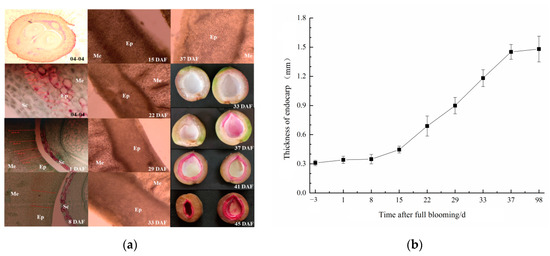 (a) Changes of tissue and lignin deposition during endocarp developing. Me, Mesocarp; Ep, Endocarp; Sc, Seed coat. 04-04, Ovaries and endocarp stain with saffron; 1 and 8 DAF, seed coat separate from endocarp; plates from 15 to 37 DAF show thickening of the endocarp; the right row of plates show endocarp lignin deposition stained with phloroglucinol. (b) Changes of tissue thickness during endocarp developing. Each period is repeated 5 times sampling, and the endocarp thickness is measured in n = 25.