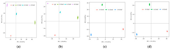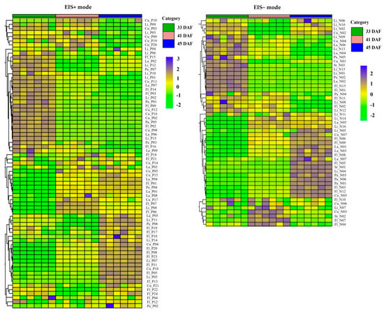 In the PCA diagram (Figure 3a,b), PC1 and PC2 represent the rate of interpretation of the dataset by the first and second principal components, respectively. As shown in Figure 3, the sum of the contribution rates of the first two principal components in the EIS+ and EIS− modes obtained from the UPLC-MS/MS original data analysis were 80.82% and 83.82%, respectively. According to the distribution of endocarp samples from 33, 41, and 45 DAF in EIS+ and EIS− modes, the six repeated samples of each developmental stage were clustered together, which indicated that the metabolites in endocarp tissues changed significantly at different developmental stages, and they were stable among different repeated samples. Similar to the PCA result, the PLS-DA diagrams showed that all samples were always classified correctly (Figure 3c,d). In order to judge the qualities of the model, 200 RPTs were performed on the model of PLS-DA. The result of the validation test (Figure S1) indicated that the PLS-DA model was validity without overfitting based on cross model validation and permutation testing.