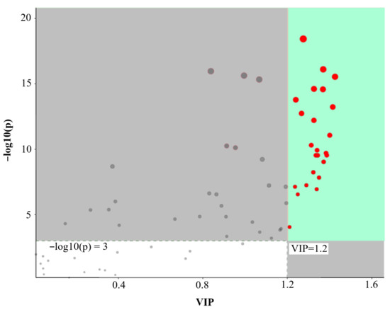 Differential metabolites were detected at the three developmental stages of apricot endocarp based on the (variable importance for the projection) VIP and p values using the PLS-DA model. Each dot represented a metabolite, and the red dot is the metabolite with significant difference among different stages.