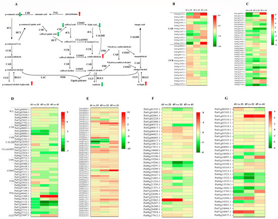 Lignin biosynthesis (A) and related gene expression (B–G) at the lignin deposition stages of apricot endocarp. The red arrow represents an increase in the relative content of the metabolite, while the green arrow represents a decrease in the relative content of the metabolite. (C,E–G) were the gene expression of POD, BGLU, LAC and POD, respectively. SK, shikimate kinase; CM, chorismate mutase; ADH, arogenate dehydrogenase; PAL, phenylalanine ammonia-lyase; C4H, cinnamate 4-hydroxylase; 4CL, 4-coumarate:CoA ligase; HCT, shikimate O-hydroxycinnamoyltransferase; C3H, p-Coumarate 3-hydroxylase; CSE, caffeoyl shikimate esterase; CcOAMT, caffeoyl-CoA O-methyltransferase; CCR, cinnamoyl-CoA reductase; F5H, ferulate 5-hydroxylase; COMT, caffeic acid O-methyltransferase; CAD, cinnamyl alcohol dehydrogenase; CALDH, coniferyl aldehyde dehydrogenase; BGLU, β-glucosidase; POD, peroxidase; LAC, laccases. Each cell represented the differentially expressed genes (DEGs) involved in the corresponding pathways. The cell color indicated the fold change of the DEGs (red means up-regulated and blue is down-regulated). The first, second and third column, respectively, represented the DEGs among 41 vs. 33 DAF, 45 vs. 33 DAF and 45 vs. 41 DAF. Different lines represent each homologous gene, which was shown in Supplementary Table S5.