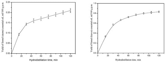 The dependence of the yield of wild fennel stems and leaves essential oil from the hydrodistillation time.