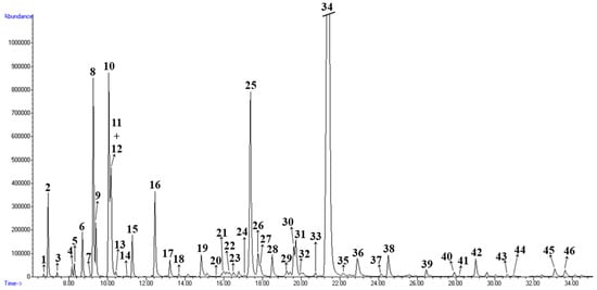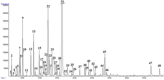 Forty-eight compounds were identified from fennel stem essential oil, which were mainly aromatic compounds (69.7%), oxygen-containing monoterpenes (14.9%), monoterpenes (6.3%) and others, where the most abundant compounds were also (E)-anethole and methyl chavicol. Gas chromatography—flame ionization detector (GC-FID) chromatogram of fennel essential oil from stem are presented in Figure 2.