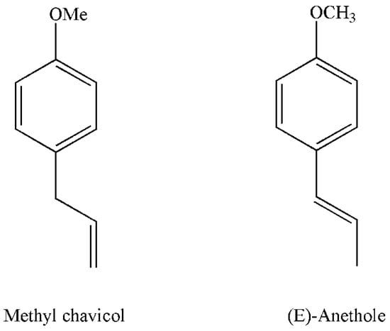 Anethol (ANE) and its isomer EST (also known as methyl chavicol) are very common ingredients of FEOs, and are usually present in fruits and flowers, as reported in numerous papers [,]. These phenylpropanoids contribute to the odor and flavor of many plants. ANE is responsible for the sweet, distinct, anise-like flavor characterizing fennel fruits [].