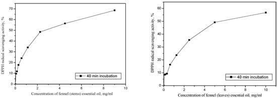 Efficient concentration—EC50 values of oil from fennel stems and leaves during 40 min incubation were presented in Figure 5. With regard to the OH scavenging activity, large differences were observed among the different samples of fennel collected in different regions. The aerial parts of the fennel from the Ternisite and the fruits from Bologna were found to be the most active, with EC50 values of 10.5 and 28.5 μg/mL, respectively []. The EC50 values of the wild and cultivated fennel seeds from Italy are very different, with the wild fennel seed having an EC50 value of 31 μg/mL and the seed from the cultivated fennel being 83 μg/mL []. Mata et al. [] also reported that the EC50 values for the ethanol extracts from Portugal were higher than for the synthetic antioxidants. The differences in antioxidant activity in the mentioned studies can be explained by the differences in origin, genotypes, agro-ecological conditions and plant parts.