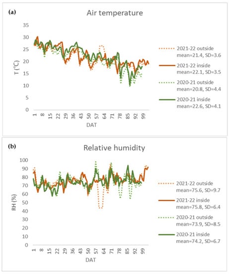 Daily mean temperature (T, °C) (a) and relative humidity (RH, %) (b) inside and outside the greenhouse during the 2020–2021 and 2021–2022 crop seasons.
