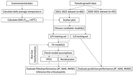 In the present study, we employed Logistic and Gompertz models to connect the several growth traits (i.e., PH, LAI, SDM, LDM, and FDM) of tomatoes with DAT and cumulative GDD. To construct a model that exhibits good adaptability, a series of steps are required, including: (1) selecting suitable model types, (2) checking model assumptions, (3) fitting models, (4) evaluating model performance, and (5) model interpretation [1,35]. The overall research schema is summarized in Figure 2.