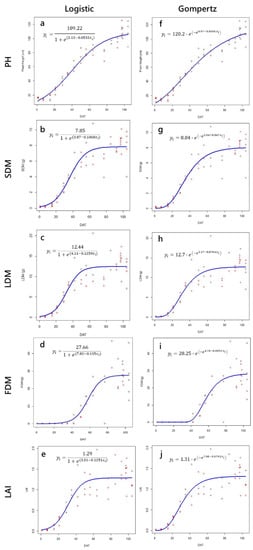 Scatter plots of the observations and fitted Logistic (left column) and Gompertz (right column) growth curves with growing degree-days (GDD) as the independent variable. (a) Plant height, (b) stem dry matter, (c) leaves dry matter, (d) fruits dry matter, and (e) leaf area index of the Logistic model. (f) Plant height, (g) stem dry matter, (h) leaves dry matter, (i) fruits dry matter, and (j) leaf area index of the Gompertz model.