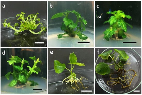 Shoot explant of Ficus carica cv. ‘Violette de Solliès’ at different stages of micropropagation: (a) multiple shoot induction in MS medium supplemented with 6.0 mg/L BAP; (b) multiple shoot induction in MS medium supplemented with 5.0 mg/L Kn; (c) multiple shoot induction in MS medium supplemented with 5.0 mg/L TDZ; (d) multiple shoot induction in MS medium supplemented with 6.0 mg/L Zea; (e) root induction in WPM supplemented with 3.0 mg/L IBA; (f) root morphology prior to acclimatization in biochar soil. Scale bars = 1 cm.