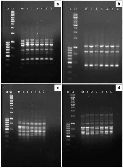 RAPD and SCoT marker profiles of mother plant and micropropagated plants (first to sixth subculture cycles) of Ficus carica cv. ‘Violette de Solliès’: (a) OPU_U20; (b) OPC_20; (c) SCoT_21; (d) SCoT_24. Lane L1 and L2 represent the 100 bp and 1 kb ladder DNA, respectively; lane M represents mother plant and lanes 1–6 represent the micropropagated plants from first to sixth subculture (n = 3).