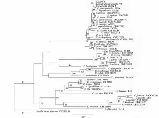 - Cai, L.; Hyde, K.D.; Taylor, P.; Weir, B.S.; Liu, Z.Y. A polyphasic approach for studying Colletotrichum. Fungal Divers. 2009, 39, 183–204. [Google Scholar] [CrossRef]