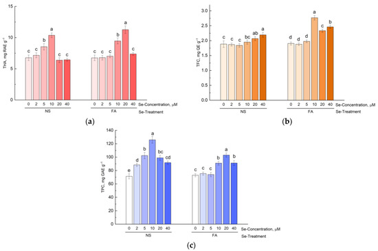 Effect of type and concentration of Se application on (a) total hydroxycinnamic acid content, (b) total flavonoid content, and (c) total phenolics content in hyssop. Different letters indicate significant differences among plants due to selenium concentration according to Tukey HSD test (p ≤ 0.05, n = 4). NS, nutrient solution; FA, foliar application; THA, total hydroxycinnamic acids; TFC, total flavonoid content; TPC, total phenolic content.