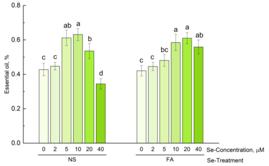Effect of type and concentration of Se application on essential oil content in hyssop. Different letters indicate significant differences among plants due to selenium concentration according to Tukey HSD test (p ≤ 0.05, n = 4). NS, nutrient solution; FA, foliar application.