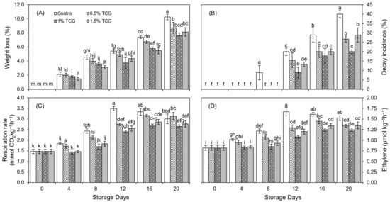 Throughout the 20-day storage period, all treatments presented a progressive weight loss tendency (Figure 1A). However, all TCG formulations had significant (p ≤ 0.05) effects in terms of reducing weight loss during the fruit storage period. In summary, on the 20th day, uncoated persimmon fruits exhibited higher (10%) weight loss whereas fruits coated with 1% TCG showed the least difference (8%) as compared with the beginning of storage.