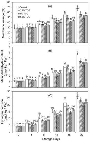 Effects of the tragacanth gum application on persimmon fruits on: (A) membrane leakage; (B) malondialdehyde content; and (C) hydrogen peroxide. Persimmon fruits stored for 20 days (analysis at 0, 4th, 8th, 12th, 16th, and 20th day) at 20 ± 2 °C, 80–85% RH. Error bars show standard deviation of the means (three replications). Graph bars bearing similar letters are not significantly different according to Tukey’s HSD test at p ≤ 0.05. Assignment of more than three letters to a bar is denoted by “−” sign between the first and last letter.