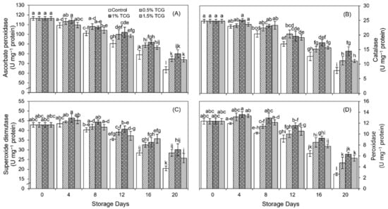 With the passage of 20 days storage period, H2O2 content considerably increased (from 4.47 µM kg−1 to 26.43 µM kg−1) in uncoated fruits, compared to the content of 19.56 µM kg−1 in the 1% TCG-coated fruits (Figure 2C). Similar to MDA contents, a significant increase in H2O2 concentration was observed after the 12th day of storage. Statistical analysis showed that TCG coatings suppressed H2O2 formation by 23% on average in coated persimmon fruits compared to uncoating fruits on the 20th day.