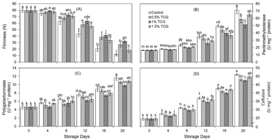 Effects of tragacanth gum application as an edible coating on: (A) firmness; (B) activity of pectinmethylesterase; (C) activity of polygalacturonase; and (D) activity of cellulase of persimmon fruits stored for 20 days (analysis on 0th, 4th, 8th, 12th, 16th, and 20th day) at 20 ± 2 °C, 80–85% RH. Error bars show standard deviation of the means (three replications). Graph bars bearing similar letters are not significantly different according to Tukey’s HSD test at p ≤ 0.05. Assignment of more than three letters to a bar is denoted by “−” sign between the first and last letter.