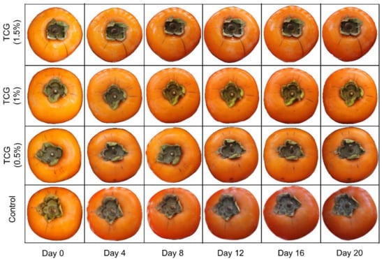 Fruit firmness is an important fruit quality factor that determines customer acceptance; however, fruit firmness decreases with an increase in storage days and ripening. It is recommended that the fruits of cv. Fuyu or similar cultivars have a minimum firmness of more than 2.5 kg or 10 N. The fruits with a firmness of less than 1.8 kg force are not considered marketable []. Loss of firmness is associated with the change in the cell wall structure. The disintegration of the cell wall leads to the destruction of the physical structure within the cells, the rupturing of the cell membrane, and the leakage of its contents; all of that accelerate fruit tissue damage []. In coated persimmons, limited availability of O2 and high level of CO2 caused by the application of TCG coating may reduce the activity of cell wall-degrading enzymes and ensure higher fruit firmness []; this was also observed in the present study. Our results agree with the previous studies where edible coatings prepared from different plant-based gums maintained higher firmness in mushroom [], banana [], sweet cherry [], and mango fruits [].