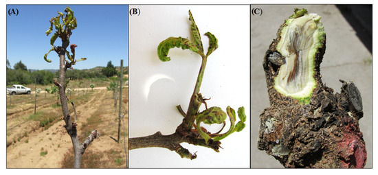 In this study, necrotic symptoms and dieback were observed in pistachio trees growing in an orchard located in Pumanque, O’Higgins region (Chile). Near 70% of the plants showed strong decline, with death of shoots, deformation of leaves, and necrosis of trunk and of vascular tissues of the twigs of the year. Thus, the main goal of this work was to identify the pathogen that causes the symptoms of dieback in pistachio trees by isolation, molecular characterization, and pathogenicity tests.