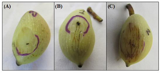 Inoculated pistachio fruits after incubation at 28 °C for one week: (A) healthy control fruit inoculated with sterile water; (B) necrotic symptoms one week after inoculation with the bacterial isolate OF148; (C) necrotic symptoms after incubation for one week with isolate OF151.
