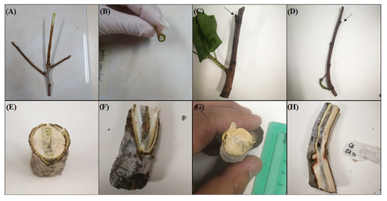 (A) Longitudinal section and (B) cross-section of healthy twig before inoculation. (C) Twig seventeen weeks after inoculation with isolate OF148 (T1). (D) Twig seventeen weeks after inoculation with isolate OF151 (T3). Black arrows indicate the point where the first necrotic tissue appeared. (E) Necrosis in the cross- and (F) longitudinal sections of trunk seventeen weeks after inoculation with isolate OF148 (T2). (G) Necrosis in the cross- and (H) longitudinal sections of trunk seventeen weeks after inoculation with isolate OF151 (T4).